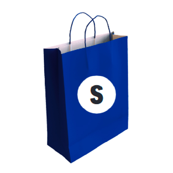 Bolsa de papel con asa retorcida. En papel kraft 100% reciclado o kraft blanco. Con las asas del mismo color de la bolsa. Si requiere de una caja completa debe pedir 250 bolsas. Medidas: 24+10×32 cm. (Ancho + Grosor x Alto).