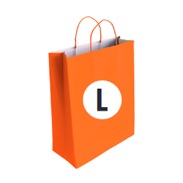 Bolsa de papel con asa retorcida. En papel kraft 100% reciclado o kraft blanco. Con las asas del mismo color de la bolsa. Si requiere de una caja completa debe pedir 250 bolsas. Medidas: 32+14×40 cm. (Ancho + Grosor x Alto).